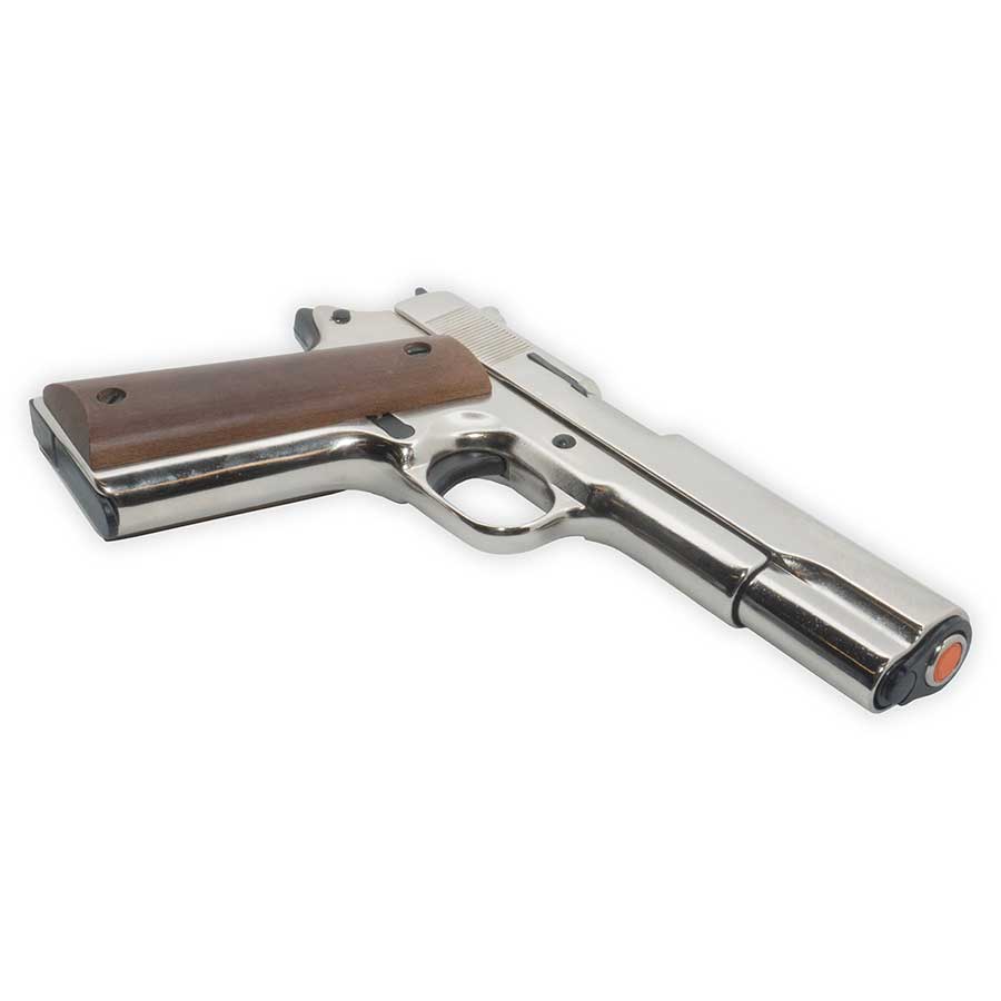 La pistola de fogueo 1911 es una pistola de fogueo semiautomática, alimentada por cargador y accionada por retroceso que funciona exactamente como una pistola real. Su acabado auténtico y su suave funcionamiento la convierten en una opción ideal para recreaciones y usos teatrales. El acabado en níquel tiene un aspecto impresionante y añade un toque distintivo a esta sólida réplica de arma de fuego. La pistola de fogueo 1911 está fabricada por Bruni en Italia.