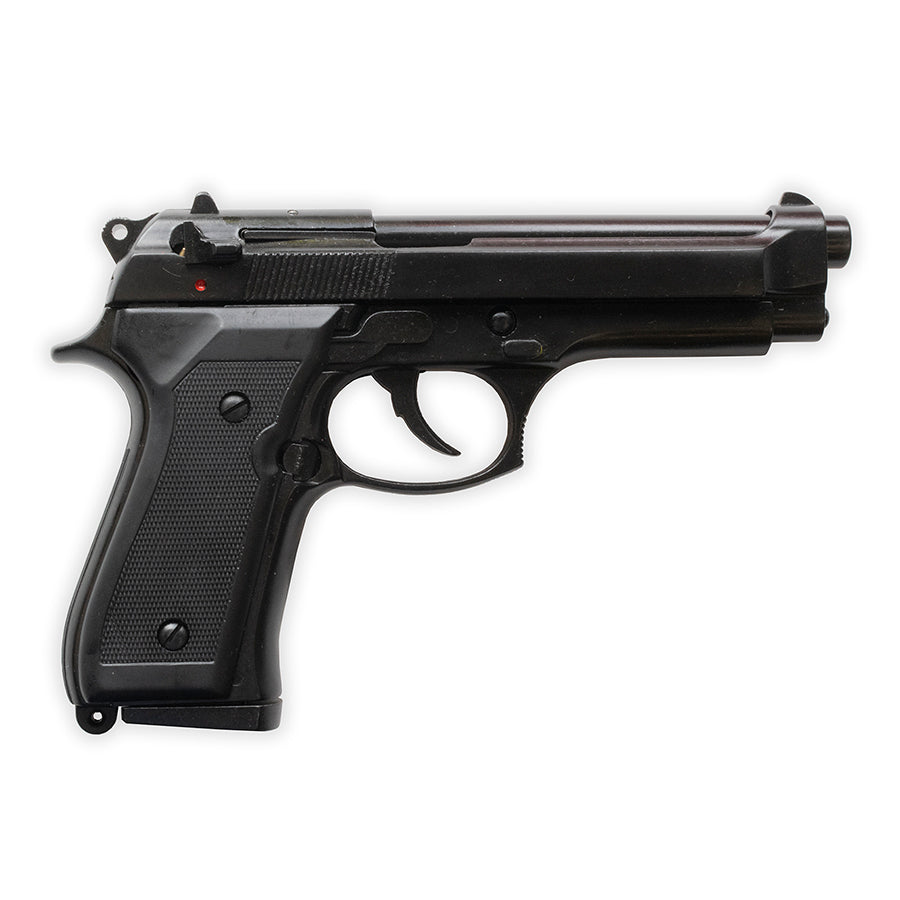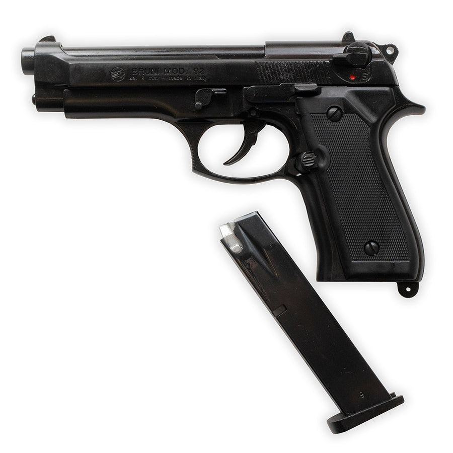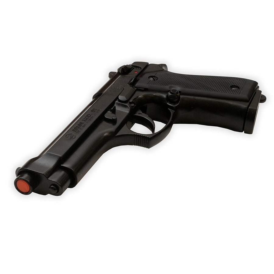 This blank firing gun represents the Beretta 92F, which in 1985 was adopted by all branches of the U.S. military as their standard issue sidearm; known widely as the M9. The M9 is essentially a military-issued version of the 92F, but props masters and armorers will use the 92F as virtually no replica M9’s are produced. Replicas like this one have been used in hundreds of movies and countless TV shows.