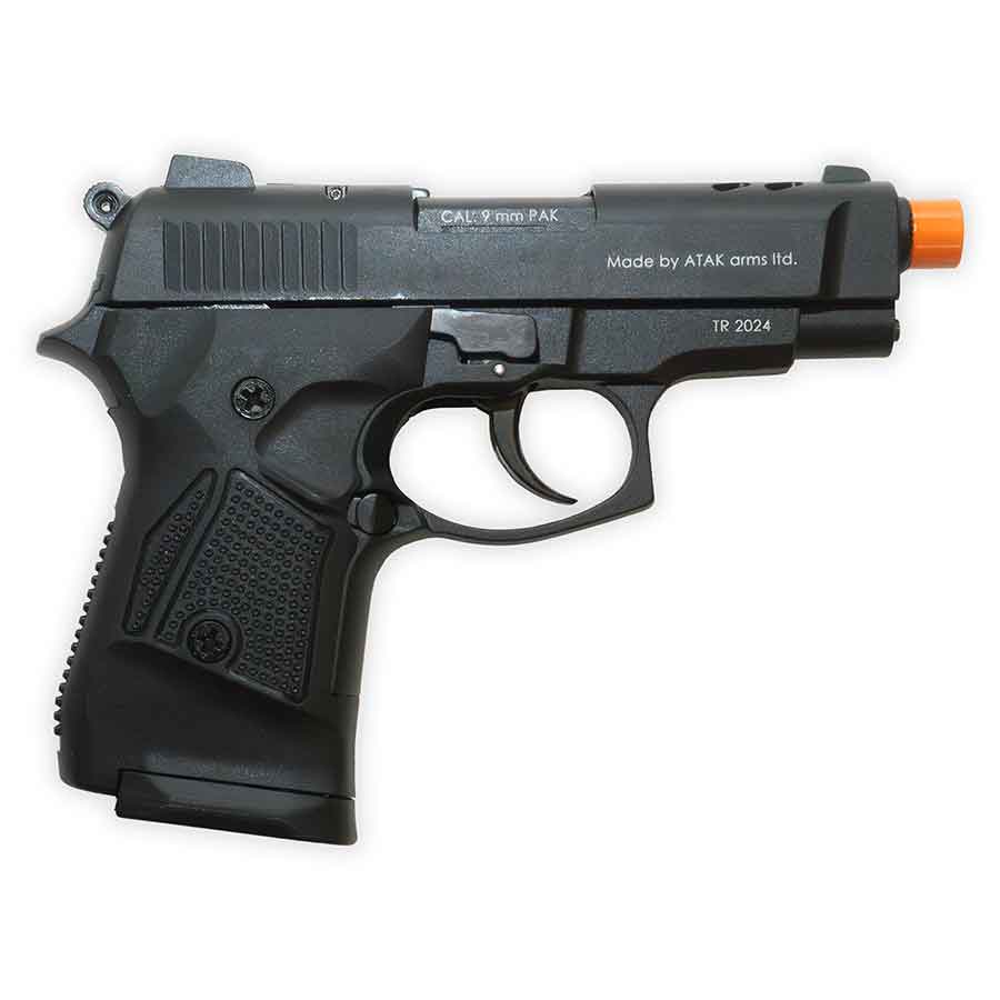The Zoraki 2914. This front-firing blank gun fires a 9mm PAK Brass Blank Ammunition Full Load (product SA09)